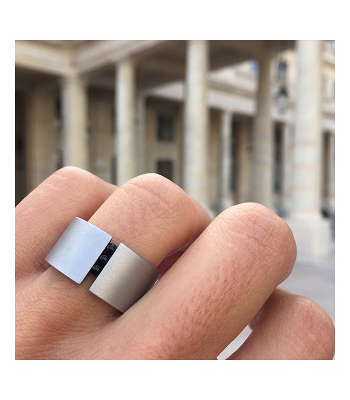 Anell d'acer gris de Niessing amb 3 boletes d'onix que tenen moviment