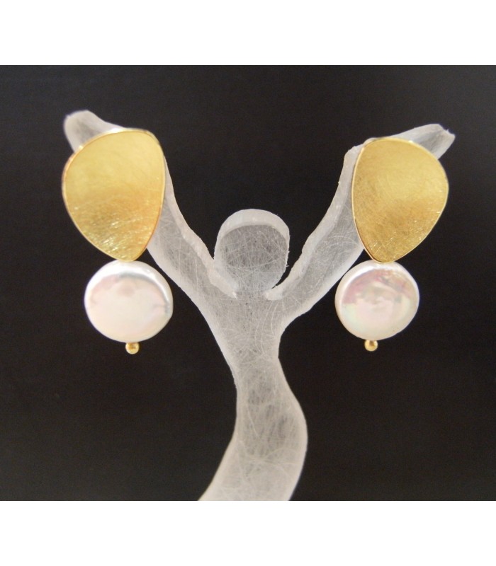 Arracades d'Or 18 quirats groc acabat mat ratllat amb perla d'aigua dolça blanca. Tancaments a pressió.