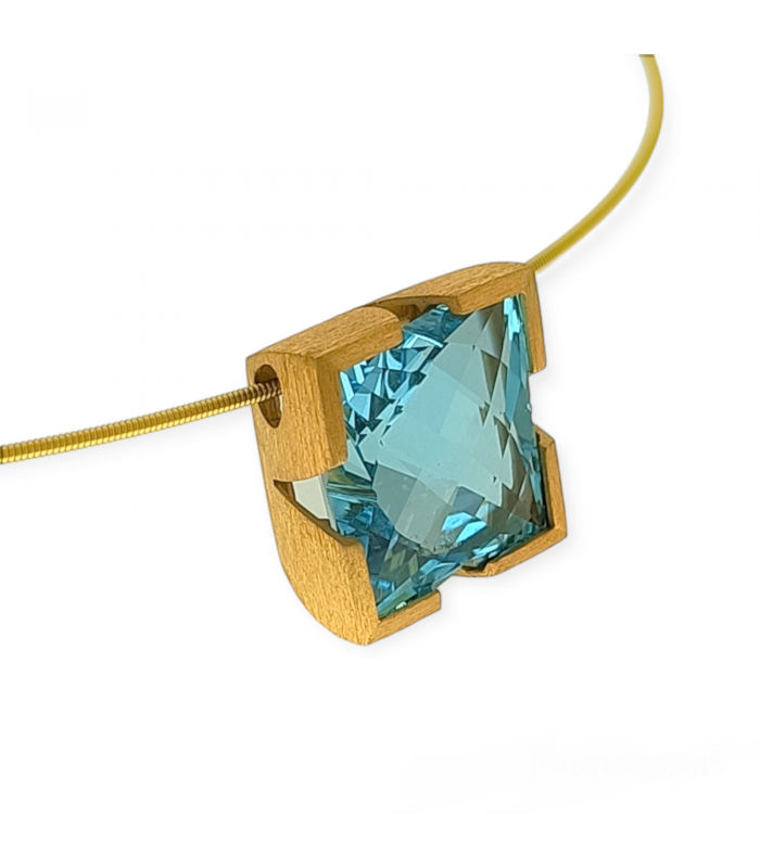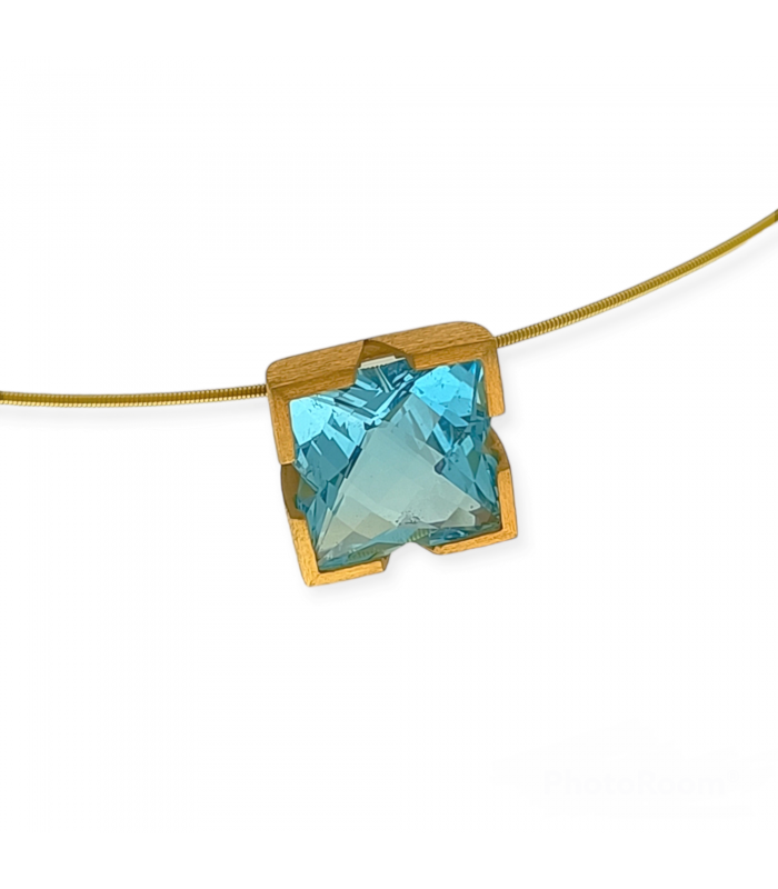 Penjant topaci blau en plata 925 amb bany en or groc 18 kt. Inclou cable en acer daurat 42 cms.