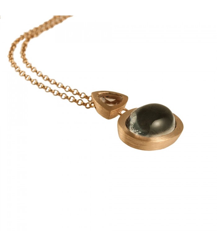 Un preciós i modern collaret de plata rosada amb un cristall de roca de 9 x 9 mm, de tall triangular, i un cabujó ovalat de 20 x 15 mm, doble de cristall Hematita / roca en un pendent de acabat brushed que es col·loca d'una cadena de plata rosada acabada amb un pràctic tancament mosquetó.