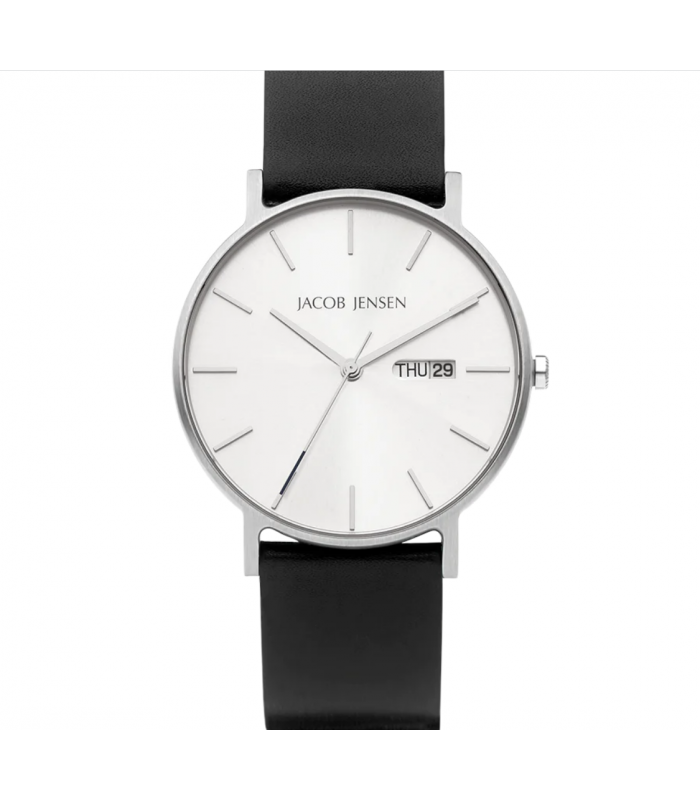 Jacob Jensen Timless Nordic JJ160. Un rellotge fantàstic fet de materials duradors i resistents. La caixa del rellotge de titani és agradable a la pell i també molt lleugera. El rellotge JJ160 de 40 mm d'ample també inclou un cristall de safir, un índex de ratlles i un moviment de quars fiable. La corretja de cuir és flexible i es pot ajustar en diferents mides.