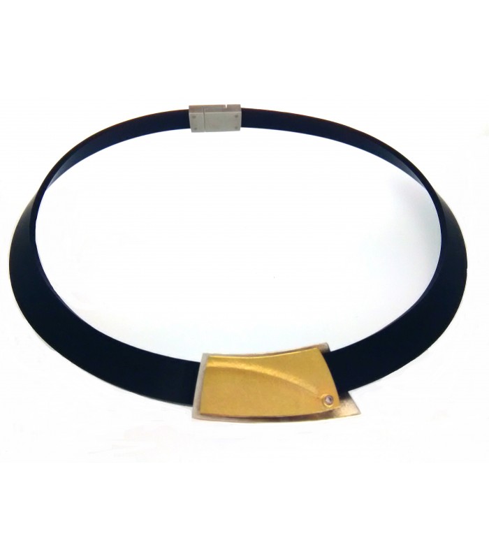 Necklace silver 925 and AU900 (22Kt) and diamont 0,03 ct TW-VS1, with black rubber. The combination of materials that give the piece its own and very modern style.