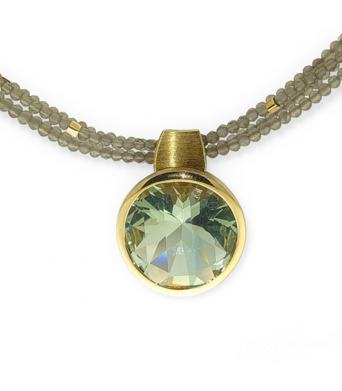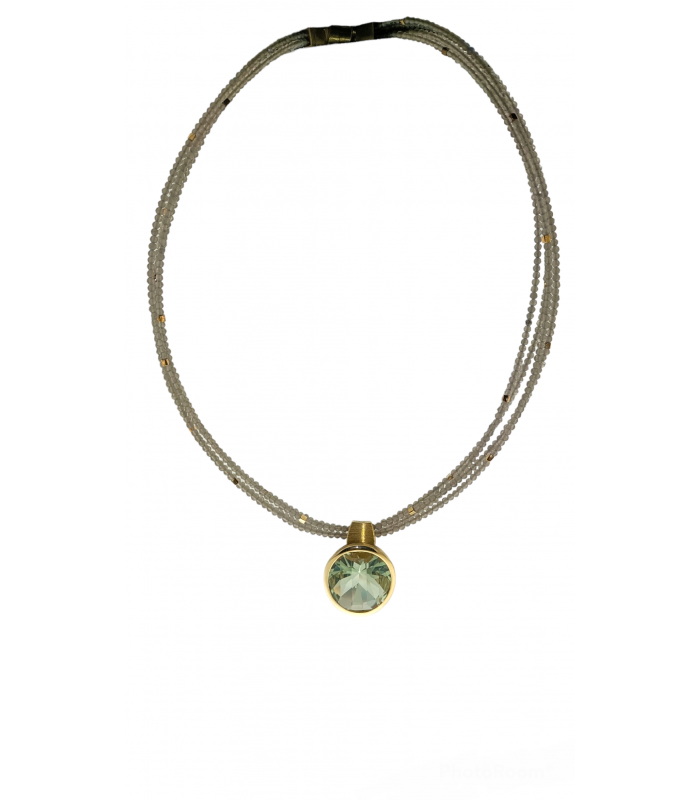 Necklace 4 strips of natural stones of moonstone, with pendant in 925 silver with bath in 18 kt yellow gold and natural amethyst green stone. Close Magnet.
