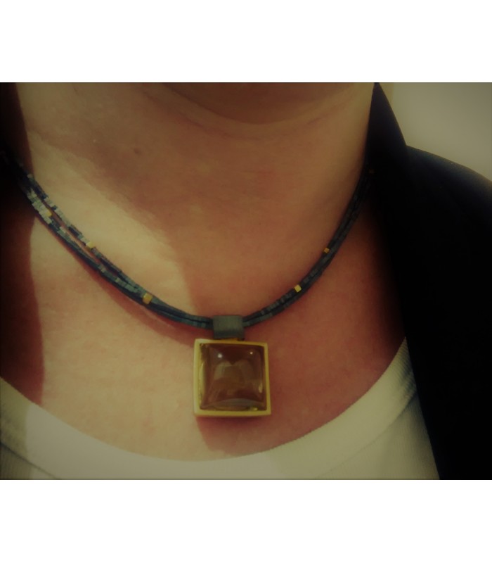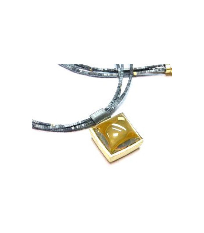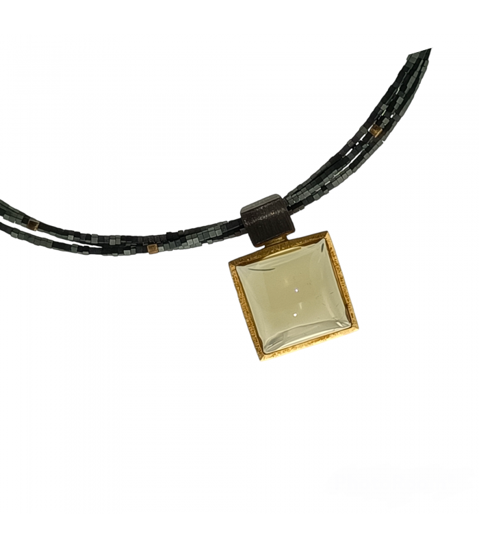 Necklace natural stones, 2 strips of hematite in 925 silver with black rhodium and goldplated, square quartz lemon pendant 19 x 19 m.m. Close Magnet.