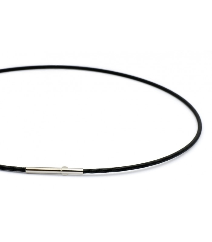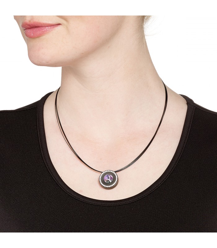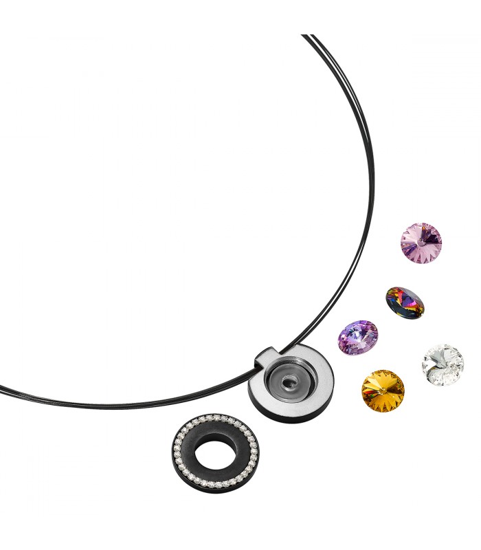 Pendant in black steel with zirconia in its outline, with possibility to change the central stone of 10 m.m of color. Includes black steel cable with bayonet lock 42 cms.