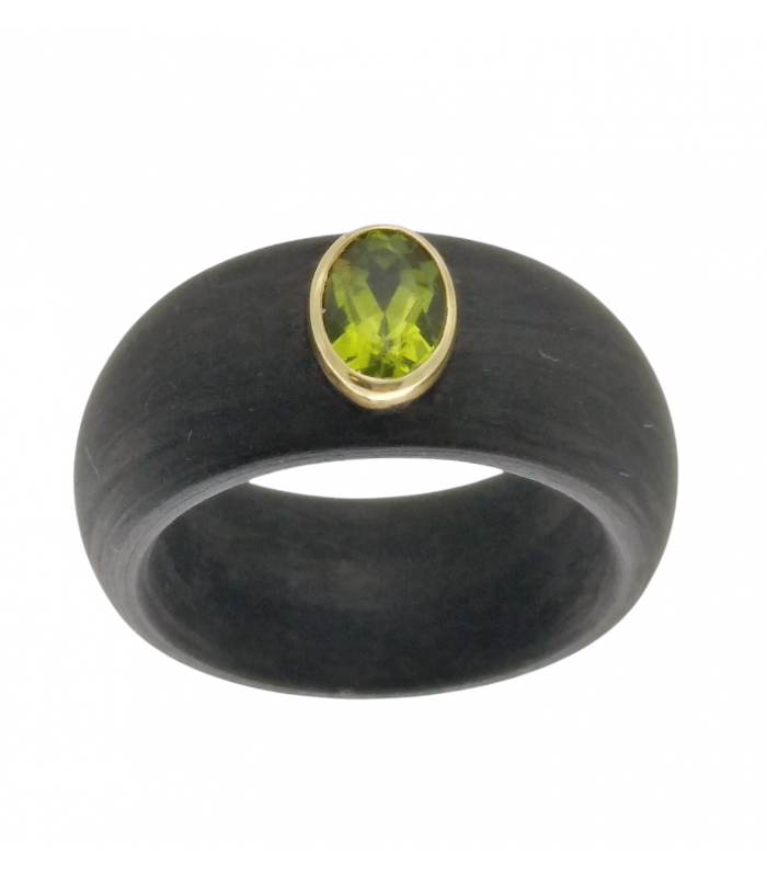 Anillo carbón 10m.m ancho oval con peridoto ovalado y castón en oro amarillo 14 kilates.