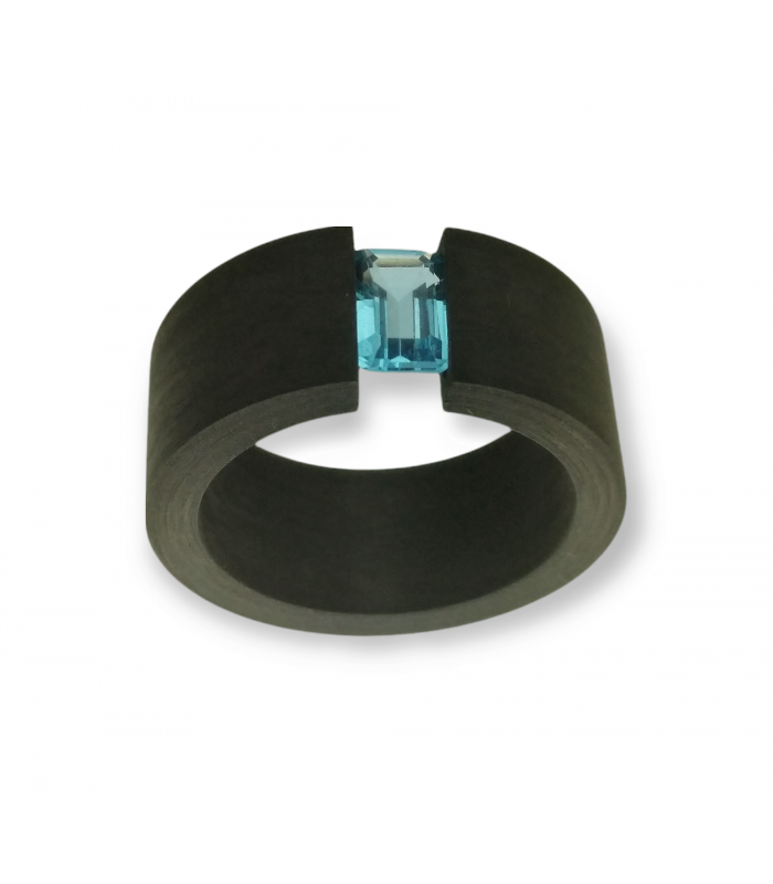 Anillo carbón 9 m.m ancho con topacio swiss corte baguette engastado en tensión.