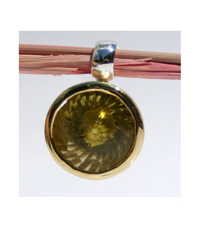 Colgante de plata 925 con baño en oro 18 kilates y Cuarzo Limón de 14 m.m de diametro de 6,35 ct aprox. facetado.