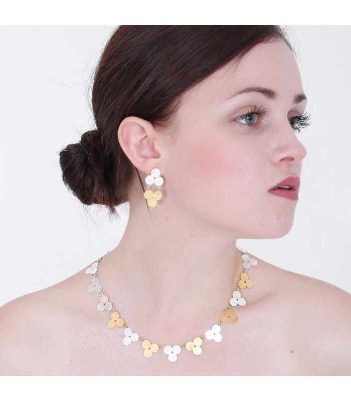 Pendientes trebol realizados en plata con baño de oro 18 kilates. Cierres de presión.