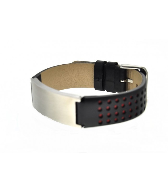 Pulsera masculina en Acero y correa de cuero negro con puntitos rojos. 23 cms regulable.